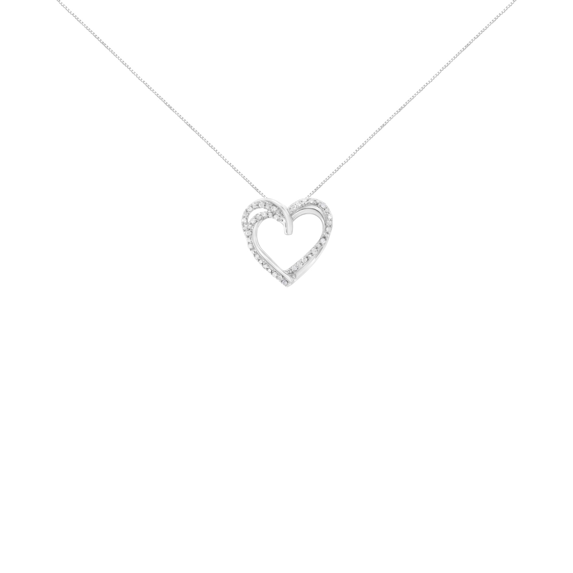 This stunning and classic diamond pendant is fashioned in .925 sterling silver. The design features a double looped heart that glistens with 1/4ct TDW of round cut diamonds. The pendant suspends along a box chain that secures with a spring ring clasp.